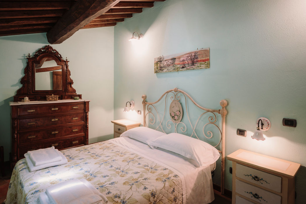 Situato al primo piano e arredato con gusto, l'appartamento è composto da una cucina, un soggiorno con camino, due camere matrimoniali, una camera con due letti singoli (con possibilità di aggiungerne uno) e due bagni con doccia. Il piccolo terrazzo in cima alla tradizionale scala in pietra, tipica delle case di montagna toscane, offre una vista indimenticabile sulla valle sottostante.